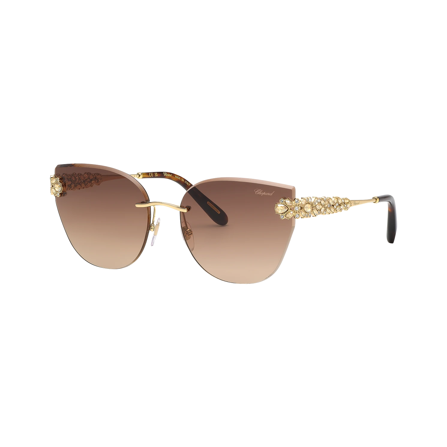 Refined cat-eye sunglasses with faceted rimless lenses. Their metal temples are enhanced with 78 premium crystals of differing sizes and colours, which combine to evoke a bouquet of flowers.