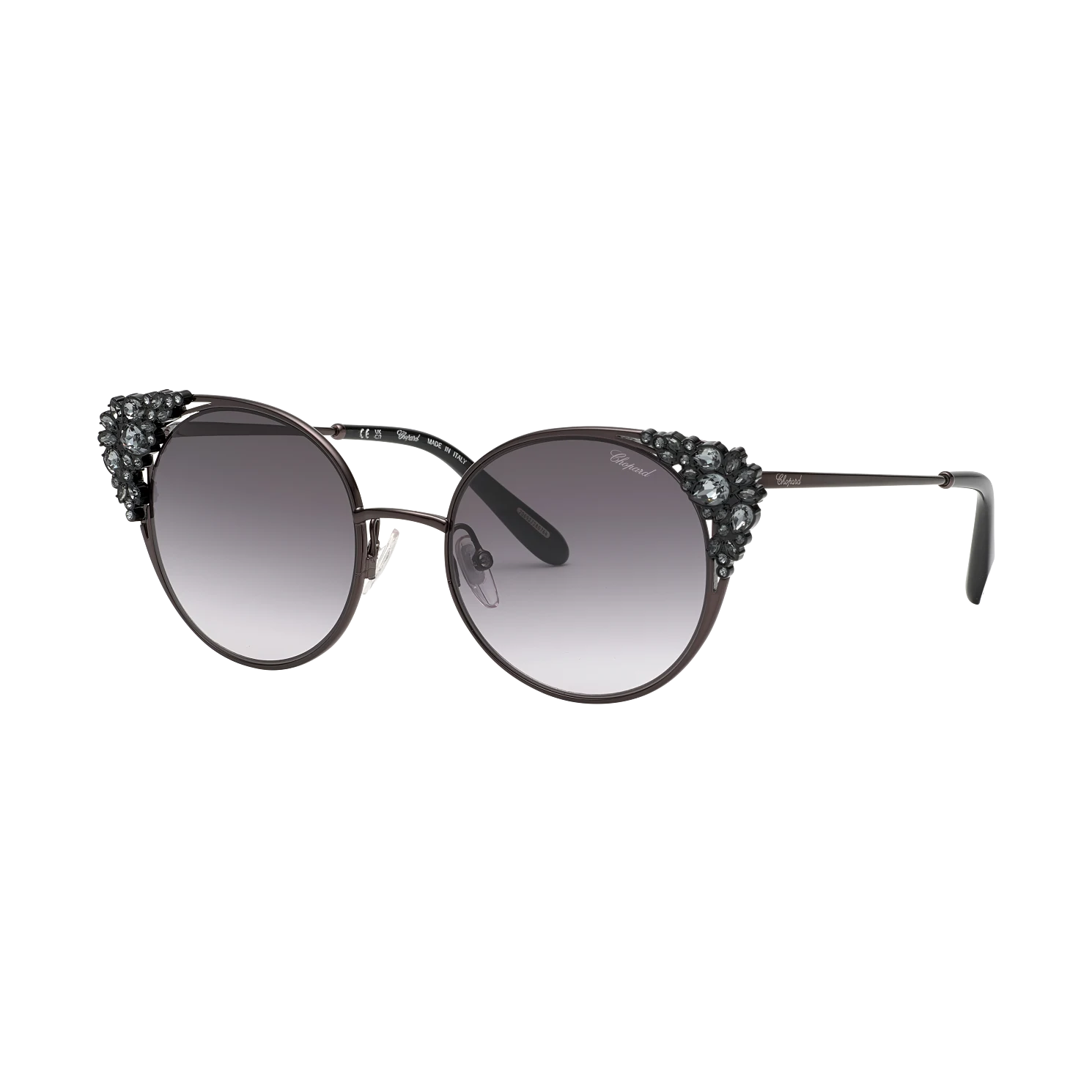 Metal sunglasses with round profiles enhanced with a precious three-dimensional decoration made with 44 high-quality crystals on both sides. The ornament is a nod to the Parisian Maison’s iconic ”Caroline’s dreams” high jewellery collection.